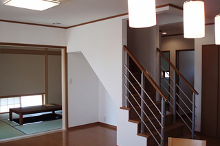 階段をセンターにもってくることで、来客を気にせずにサービススペースへの導線を確保。